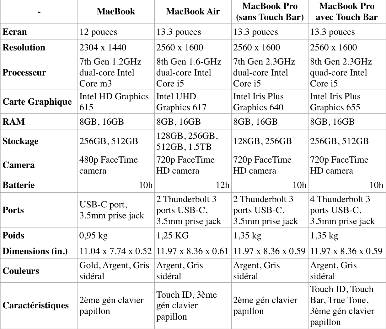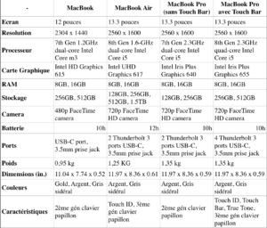 Maintenant que le MacBook Air a été réaménagé, il n’est plus au prix de 1 000 euros. Au lieu de cela, l’Air a abandonné son avantage de prix au profit de spécifications plus compétitives. Mais avec le MacBook Pro 13 pouces, il peut sembler plus facile de dépenser quelques euros de plus pour un modèle qui, à certains égards, est plus puissant. Les autres MacBook sont en retard sur les mises à jour. Parallèlement, Apple n’a pas mis à jour les MacBook et MacBook Pro (sans la barre tactile) depuis plus d’un an, ce qui signifie que les processeurs et les claviers sont datés. Acheter un ordinateur portable avec une puce Intel de 7ème génération signifie perdre des gains de performances. Obtenir un clavier Butterfly de seconde génération pourrait signifier certaines des difficultés dont se plaignent les utilisateurs, telles que les clés inattendues. Le nouveau MacBook Air présente encore quelques inconvénients: sa vitesse d’horloge est inférieure à celle du Pro et, comme c’est le cas pour ses prédécesseurs, son stockage de base est faible (bien qu’il soit possible de mettre à niveau jusqu’à 1,5 To). Que ceux-ci soient suffisants pour vous orienter ou non vers les grands MacBooks, le fait de consulter toutes les spécifications aidera certainement à la décision. Pour simplifier les choses, nous examinons les spécifications de base et les prix de départ de chaque MacBook.