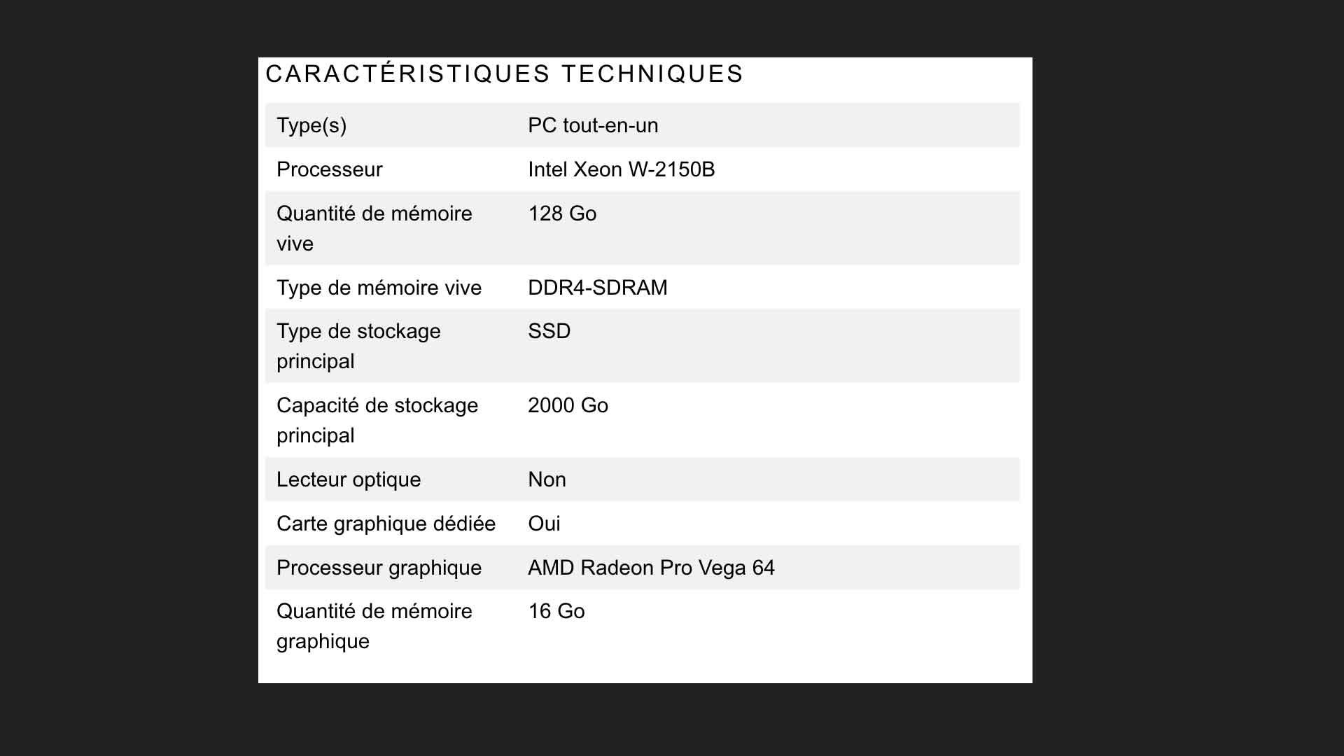 L’Apple iMac Pro est un PC tout-en-un doté d’un écran 27 pouces 5K. Il est décliné en plusieurs configurations, proposant des processeurs Intel Xeon W (à 2,3/2,5/3/3,2 GHz), embarquant 32, 64 et 128 Go de mémoire vive, tandis que le stockage SSD est de 1, 2 ou 4 To. Côté carte graphique, il faudra choisir entre deux cartes AMD, la Radeon Vega Pro 56 (8 Go) et la Vega Pro 64 (16 Go).