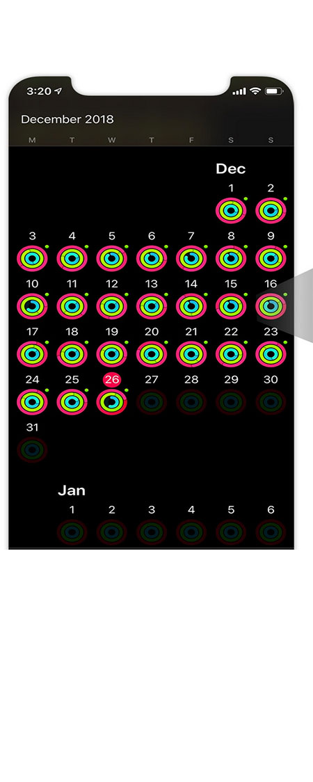 Dans l’application Activité, chaque jour que vous enregistrez une séance d’entraînement, vous obtenez un point vert en regard de votre activité. C’est un excellent indicateur visuel de la progression de votre série au fil du temps. Voilà votre motivation: ces petits points verts.